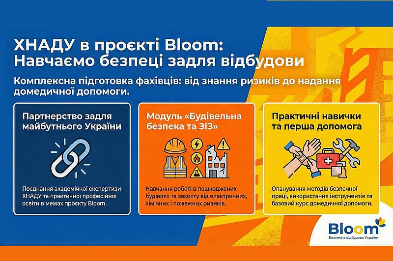 Долучившись до проєкту Bloom як активний партнер, наш заклад об’єднав потужну академічну експертизу з практичною складовою професійної освіти, щоб спільно готувати фахівців для майбутнього відновлення України.