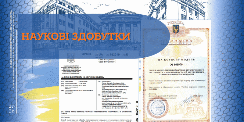 Патент № 162019: «Спосіб хіміко-термічної обробки трубопресового інструмента зі штампових сталей». Автори: Пінчук В.Л., Дейнеко Л.М., Столбовий В.О., Андреєв А.О., Кривчик Л.С., Шпортько Ю.В. Опубліковано: 05.02.2026.