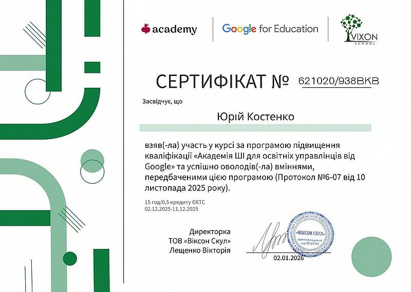 Відповідно до Листа МОН № 22/491-25 від 25.11.2025 р. «Про програму «Академія ШІ для освітніх управлінців» доцент кафедри обліку і оподаткування, гарант ОП «Облік і оподаткування» Костенко Юрій Олексійович взяв участь у курсі за програмою підвищення кваліфікації «Академія ШІ для освітніх управлінців від Google» та успішно оволодів вміннями, передбаченими цією програмою з 02.12.2025 по 11.12.2025 в обсязі 15 год/0,5 кр ЄКТС.