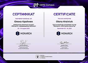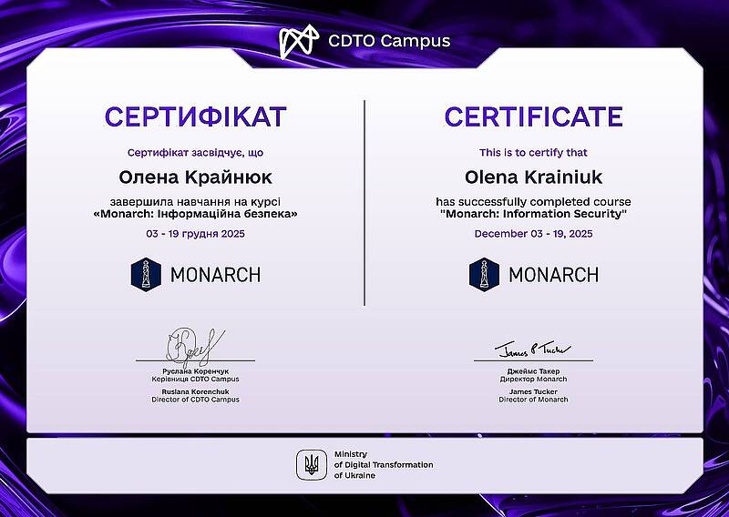 Завідувачка кафедри кібербезпеки Олена Крайнюк успішно завершила навчання за програмою «Monarch: Інформаційна безпека», організованою CDTO Campus (проєкт Міністерства цифрової трансформації України) у партнерстві з міжнародною ініціативою Monarch. Навчання проходило з 3 по 19 грудня 2025 року та було спрямоване на поглиблення знань у сфері захисту даних та інформаційної безпеки. Програма «Monarch: Інформаційна безпека» реалізується в межах «Талліннського механізму» — міжнародної ініціативи з посилення кіберстійкості України. Курс охопив ключові принципи та практики, необхідні для створення безпечного інформаційного середовища в організаціях. Під час навчання учасники опанували такі важливі компетенції: • Управління ризиками та відповідність стандартам: вивчення методів ідентифікації загроз та забезпечення дотримання нормативних вимог у сфері безпеки. • Захист даних та реагування на інциденти: практичні навички захисту облікових записів, роботи з вразливостями та реагування на кіберінциденти. • Розробка політик безпеки: створення внутрішніх стратегій та політик для забезпечення цілісності інформаційних систем. • Кібергігієна: впровадження сучасних підходів до захисту інформації в щоденній діяльності організації. Отримання сертифіката такого рівня підтверджує прагнення наших фахівців до постійного професійного розвитку та відповідності найвищим стандартам цифрової безпеки. Набуті знання будуть імплементовані в роботу університету для підвищення загального рівня кіберстійкості нашої освітньої установи.