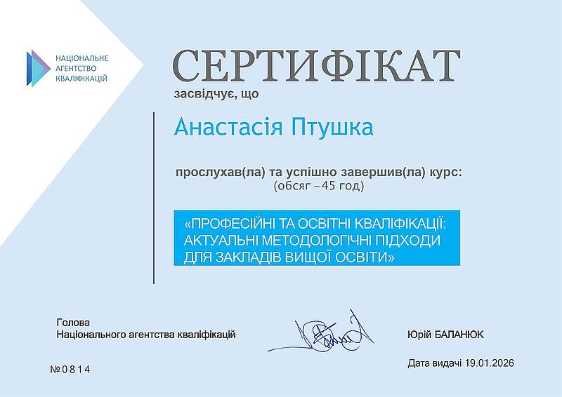 Завідувачка кафедри іноземних мов доцент Птушка А.С. успішно пройшла курс національного агентства кваліфікацій «Професійні та освітні кваліфікації: актуальні методологічні підходи для закладів вищої освіти».
