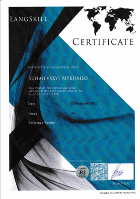 Асистент кафедри АКІТ Бугаєвський М.С. отримав сертифікат про рівень володіння англійською мовою B2.