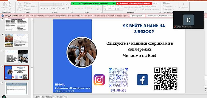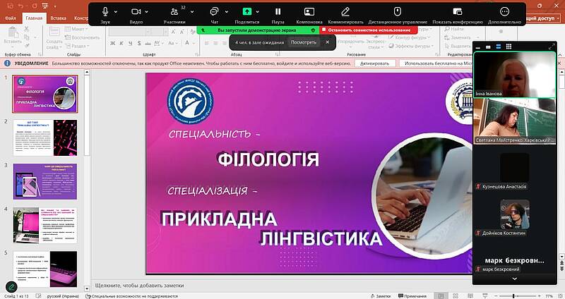Кафедра іноземних мов провела профорієнтаційні онлайн-зустрічі з одинадцятикласниками у Харківських ліцеях №108, №13 та №54. Метою заходів було ознайомлення майбутніх абітурієнтів зі спеціальністю В11«Філологія», спеціалізацією В11.10 «Прикладна лінгвістика», яка органічно поєднує гуманітарні знання та цифрові технології.