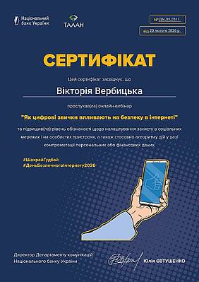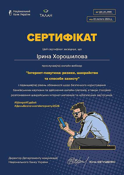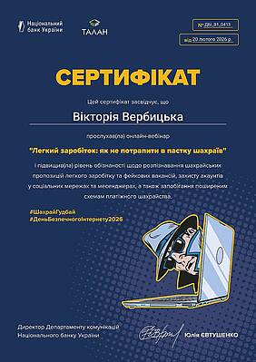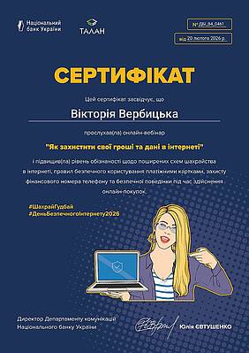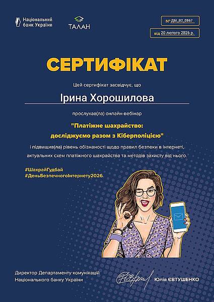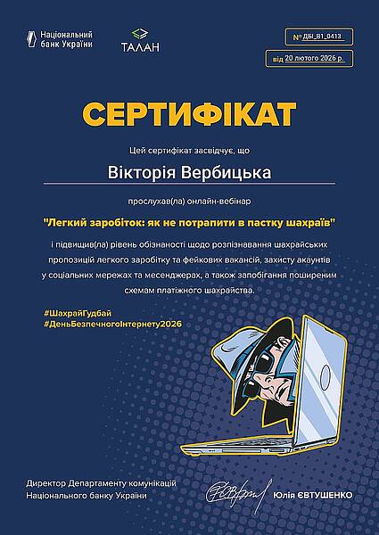 У період з 9 по 13 лютого 2026 року викладачі кафедри обліку і оподаткування доценти Вербицька В.І та Хорошилова І.О. взяли участь у серії просвітницьких вебінарів, організованих Національним банком України спільно  з Департаментом кіберполіції Національної поліції України, КРЕДОБАНКом, ПриватБанком та Райффайзен Банком. якими проводилась інформаційна кампанія з підвищення фінансової грамотності та кібербезпеки населення.  Програма заходів була присвячена актуальним питанням протидії платіжному шахрайству, захисту персональних даних та безпечному користуванню цифровими сервісами.