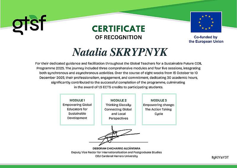 Вітаємо наших студентів ОП "Прикладна лінгвістика", які під керівництвом доц. Наталії Скрипник успішно завершили участь у програмі міжнародного віртуального обміну "Global Teachers for Sustainable Future" та отримали відповідні сертифікати.