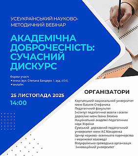 Запрошуємо до участі у Всеукраїнському науково-методичному вебінарі "Академічна доброчесність – сучасний дискурс", який відбудеться 25 листопада 2025 року о 14:00.