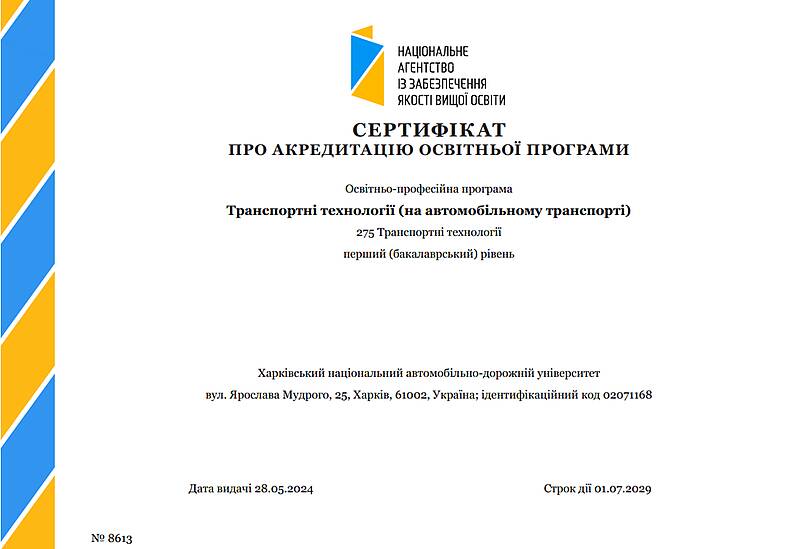 10 травня 2024 року на черговому засіданні Національного агентства із забезпечення якості вищої освіти було ухвалено рішення про успішну акредитацію освітньо-професійної програми "Транспортні технології (на автомобільному транспорті)" за спеціальністю 275 Транспортні технології першого (бакалаврського) рівня вищої освіти.