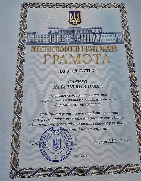 Завідувач кафедри іноземних мов Харківського національного автомобільно-дорожнього університету Саєнко Наталія Віталіївна отримала Грамоту від Міністерства освіти і науки України за ініціативу та наполегливість, високий професіоналізм, сумлінне виконання службових обовʼязків та вагомий особистий внесок у розвиток сфери освіти і науки України.