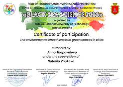 Здобувачі Альбіна Ткаченко і Микола Грязнов представили роботу «Analysis of the implementation of ecosystem services provided by urban forests» (науковий керівник доцент Прокопенко Н.В.), Анна Шаповалова представила роботу «The environmental effectiveness of green spaces in cities» (науковий керівник професор Внукова Н.В), Ельвіра Немченко представила роботу «The impact of urban park reconstruction on their ecosystem services» (науковий керівник доцент Калюжна Ю.С.) отримали сертифікати учасників.