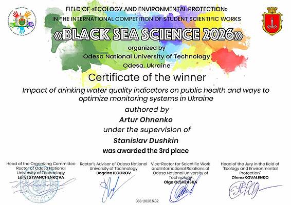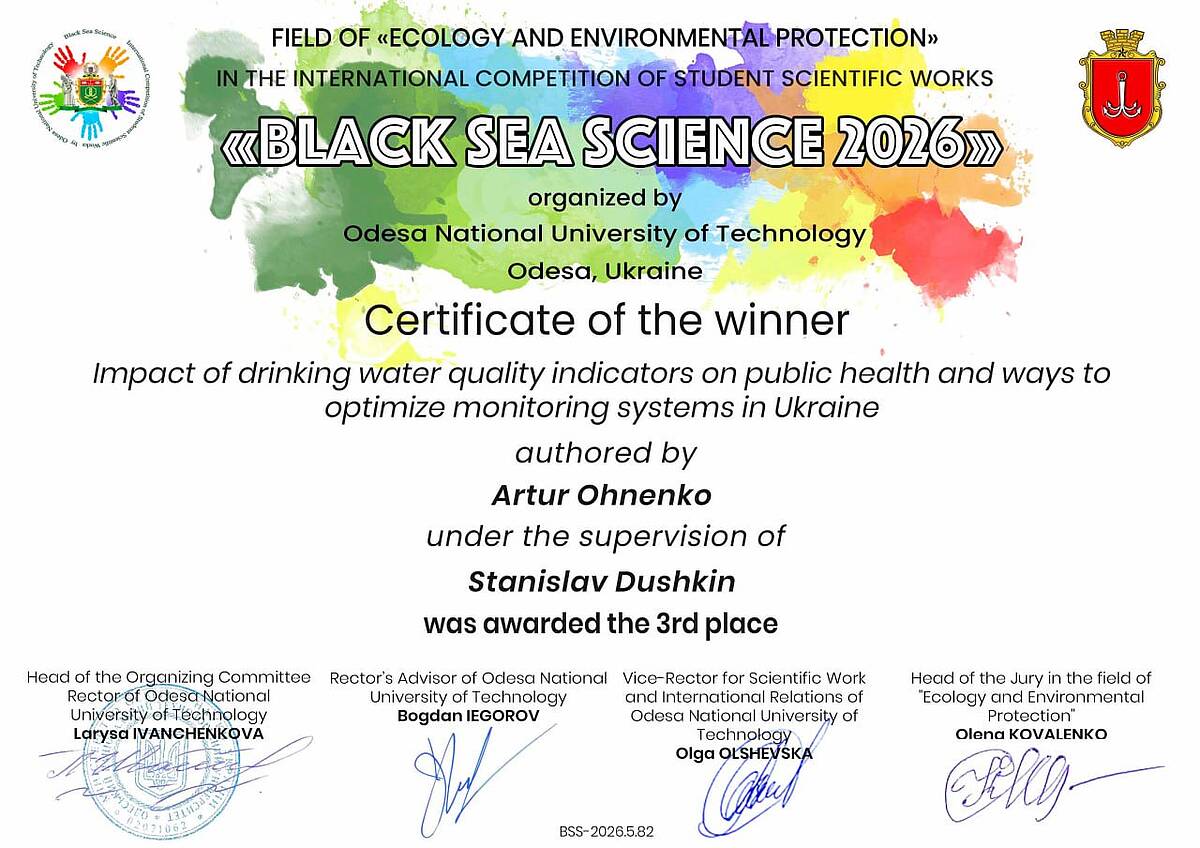 Здобувач другого (магістерського) рівня вищої освіти Артур Огненко представив роботу «IMPACT OF DRINKING WATER QUALITY INDICATORS ON PUBLIC HEALTH AND WAYS TO OPTIMIZE MONITORING SYSTEMS IN UKRAINE» (науковий керівник доцент Душкін С.С.) та отримав сертифікат ІІІ ступеня.