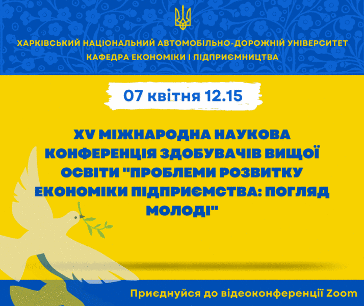 Інформуємо вас, що дату проведення ХV Міжнародної наукової конференції здобувачів вищої освіти «Проблеми розвитку економіки підприємства: погляд молоді» перенесено на 07 квітня 2022 року.