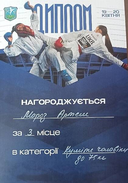 У святкові вихідні 19-20 квітня у столиці відбувся Кубок Київа-2025 з карате. У змаганнях взяли участь 20 клубів і понад 700 спортсменів. Серед них – здобувач вищої освіти Мороз Артем (ДГ-21-23), який у ваговій категорії до 75 кг у категорії змагань «Куміте молодь-чоловіки» посів ІІ місце та ІІІ місце у категорії «Куміте чоловіки».