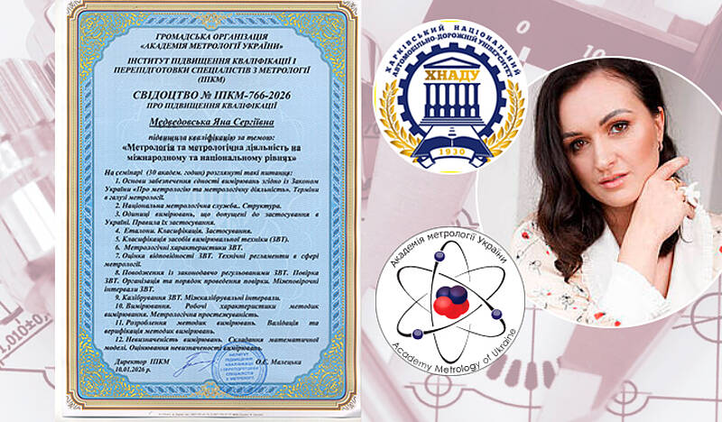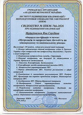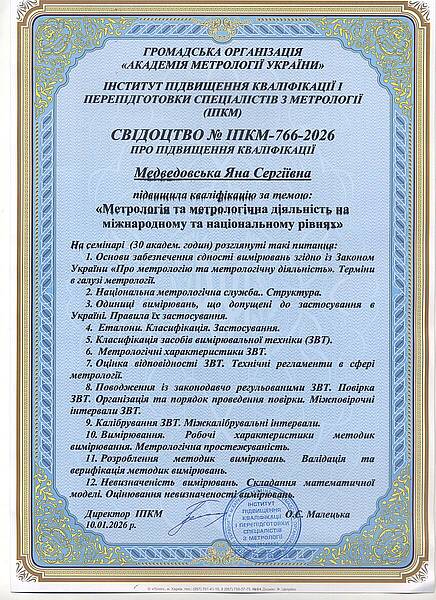 Доцентка кафедри метрології та БЖД Медведовська Я. С.  підвищила кваліфікацію за темою "Метрологія та метрологічна діяльність на міжнародному та національному рівнях" на базі Громадської організації "Академія метрології України" та Інстуту підвищення кваліфікації і перепідготовки спеціалістів з метрології (ІПКМ) під керівництвом директора ІПКМ Малецької О.С.