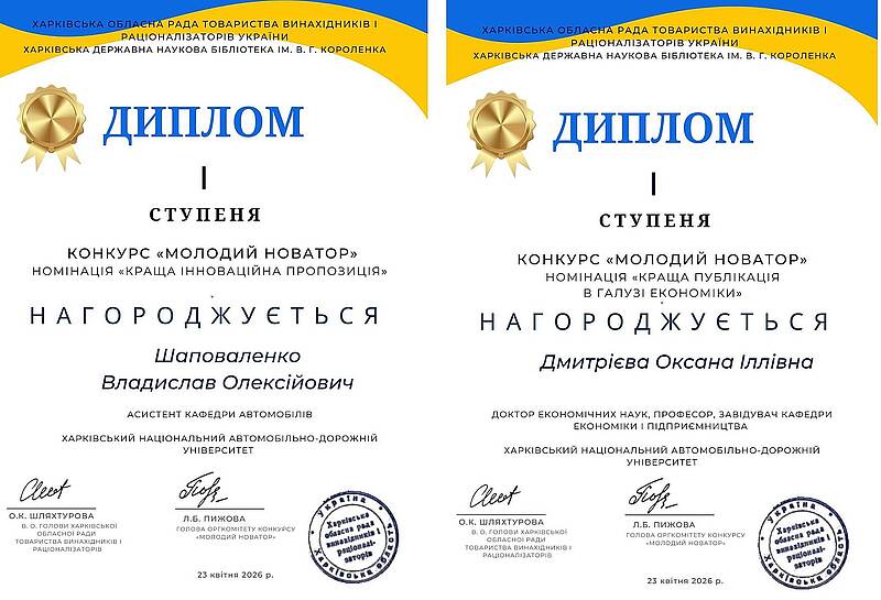 1. Шаповаленко Владислав Олексійович, асистент кафедри автомобілів, за кращу комплексну розробку в транспортній галузі (патенти на корисні моделі «Гібридна біокомпозитна кузовна панель транспортного засобу з інтегрованою функцією самодіагностики» №162254 від 05.03.2026 та «Спосіб виготовлення гібридної біокомпозитної кузовної панелі транспортного засобу з інтегрованою функцією самодіагностики» №162563 від 02.04.2026).