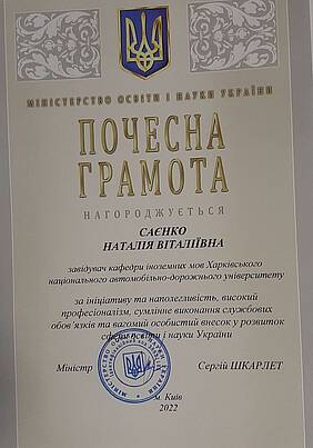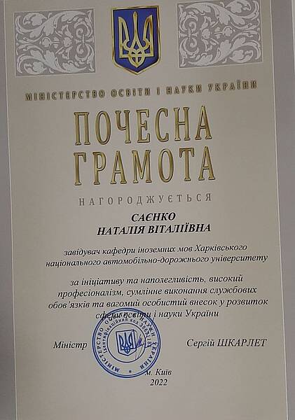 Завідувач кафедри іноземних мов Харківського національного автомобільно-дорожнього університету Саєнко Наталія Віталіївна отримала Почесну грамоту від Міністерства освіти і науки України за ініціативу та наполегливість, високий професіоналізм, сумлінне виконання службових обовʼязків та вагомий особистий внесок у розвиток сфери освіти і науки України.