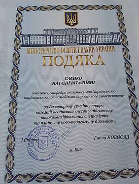 Завідувачка кафедрою іноземних мов Харківського національного автомобільно-дорожнього університету Саєнко Наталія Віталіївна отримала Подяку від Міністерства освіти і науки України за багаторічну сумлінну працю, вагомий особистий внесок у підготовку висококваліфікованих спеціалістів та плідну науково-педагогічну діяльність.