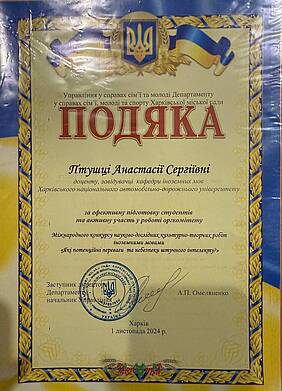 Завідувачка кафедрою іноземних мов  Харківського національного автомобільно-дорожнього університету, доц. Птушка Анастасія Сергіївна отримала Подяку від Управління у справах сім'ї та молоді Департаменту у справах сім'ї, молоді та спорту Харківської міської ради за ефективну підготовку студентів та активну участь у роботі оргкомітету Міжнародного конкурсу науково-дослідних культурно-творчих робіт іноземними мовами «Які потенційні переваги та небезпеки штучного інтелекту?»