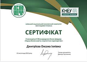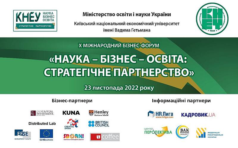 23 листопада 2022 року завідувачка кафедри економіки і підприємництва, д.е.н., проф. Дмитрієва О.І. прийняла участь у Міжнародному бізнес-форумі «Наука-бізнес-освіта: стратегічне партнерство», що проходив на базі Київського національного економічного університету імені Вадима Гетьмана.