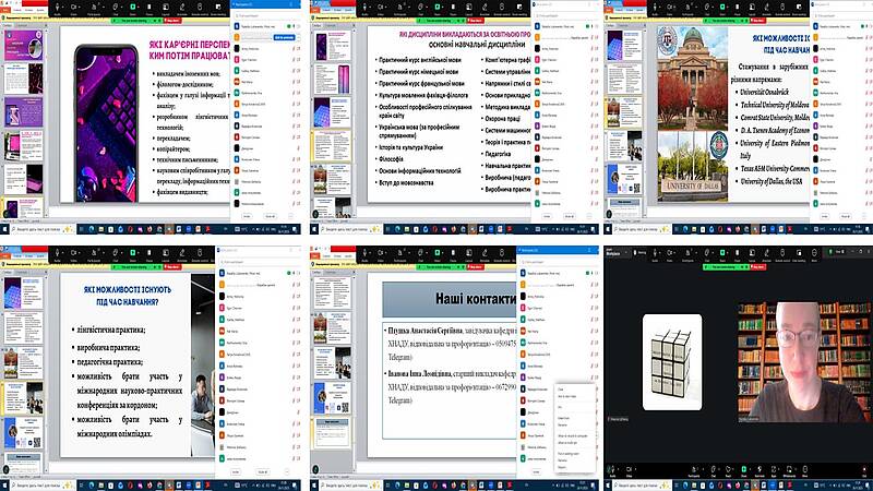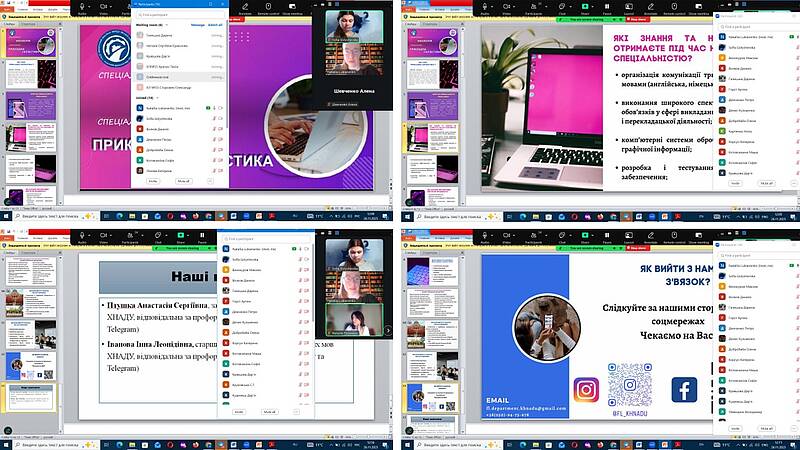 Кафедра іноземних мов провела профорієнтаційні онлайн-зустрічі з одинадцятикласниками у Харківських ліцеях №45 та №55. Метою заходу було ознайомлення майбутніх абітурієнтів зі спеціальністю В11«Філологія», спеціалізацією В11.10 «Прикладна лінгвістика», яка органічно поєднує гуманітарні знання та цифрові технології.