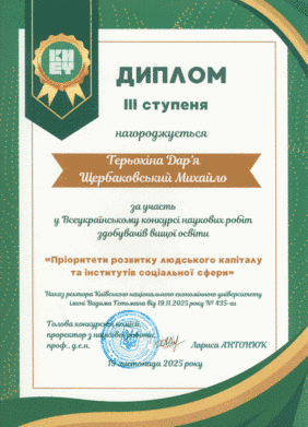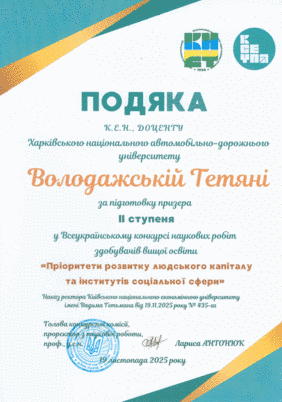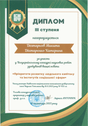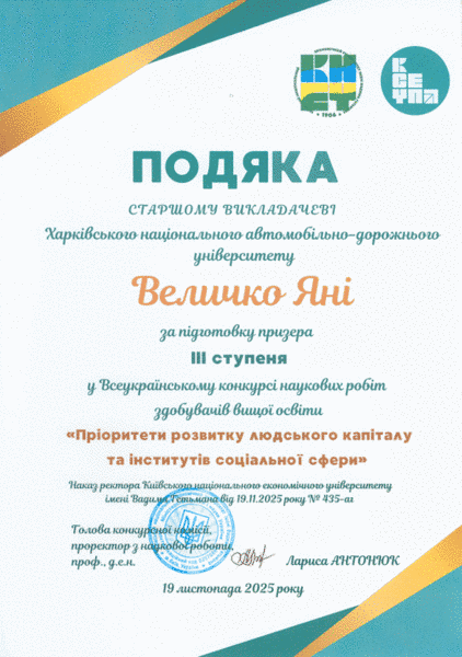 Студенти кафедри менеджменту Харківського національного автомобільно-дорожнього університету успішно взяли участь у Всеукраїнському конкурсі наукових робіт здобувачів вищої освіти «Пріоритети розвитку людського капіталу та інститутів соціальної сфери», який організовує Київський національний економічний університет імені Вадима Гетьмана. Після рецензування робіт учасників було запрошено до фінального етапу - підсумкової наукової конференції, що відбулася 19 листопада 2025 року у форматі відеоконференції Zoom. Під час відкритого захисту наші студенти представили результати своїх досліджень та відповідали на запитання конкурсної комісії.