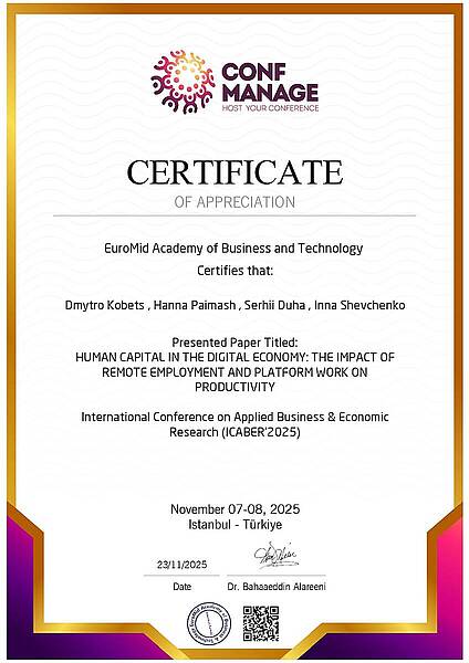 Дистанційну участь в ICABER'2025 взяла декан факультету управління та бізнесу, професор кафедри економіки і підприємництва, д.е.н., проф. Шевченко І.Ю., яка у складі авторського колективу презентувала результати дослідження за темою «Human capital in the digital economy: the impact of remote employment and platform work on productivity».