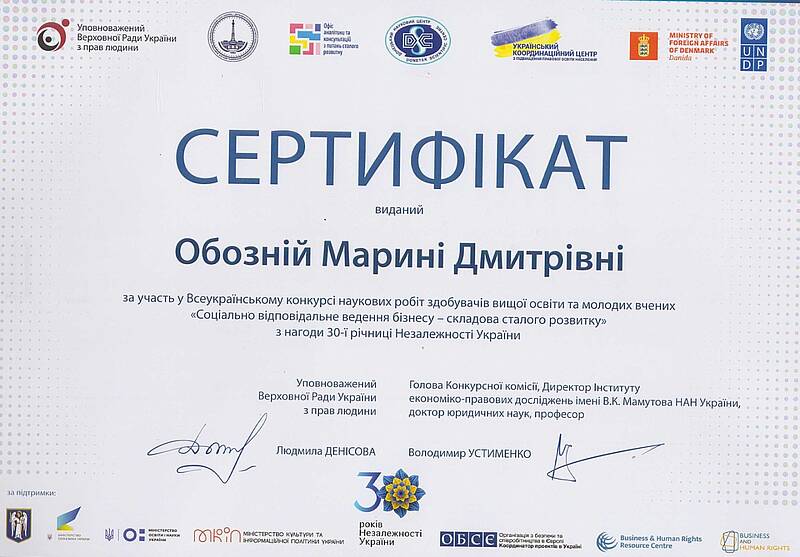 Вітаємо здобувачку вищої освіти на другому магістерському рівні за ОП «Економіка» Обозну Марину Дмитрівну з отриманням сертифіката учасника Всеукраїнського конкурсу наукових робіт здобувачів вищої освіти та молодих вчених «Соціально відповідальне ведення бізнесу – складова сталого розвитку» за підписом Уповноваженого Верховної Ради України з прав людини Людмили Денісової та Директора Інституту економіко-правових досліджень імені В.К. Мамутова Національної академії наук України Володимира Устименка.