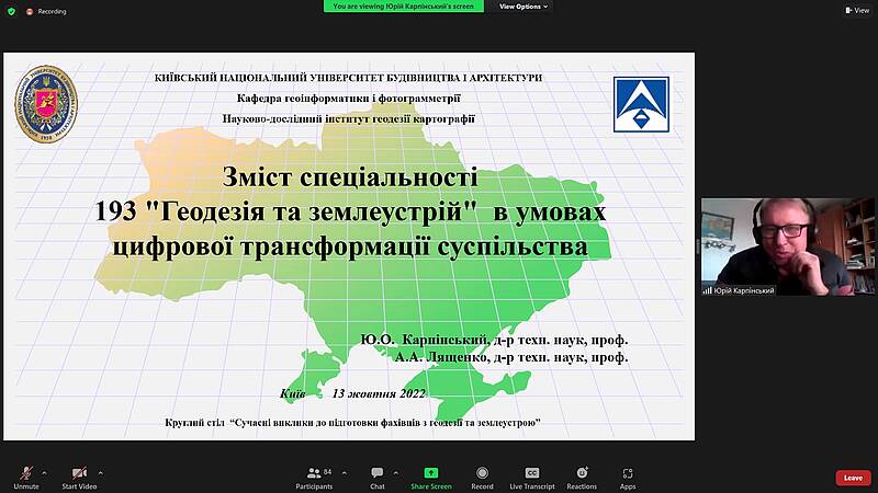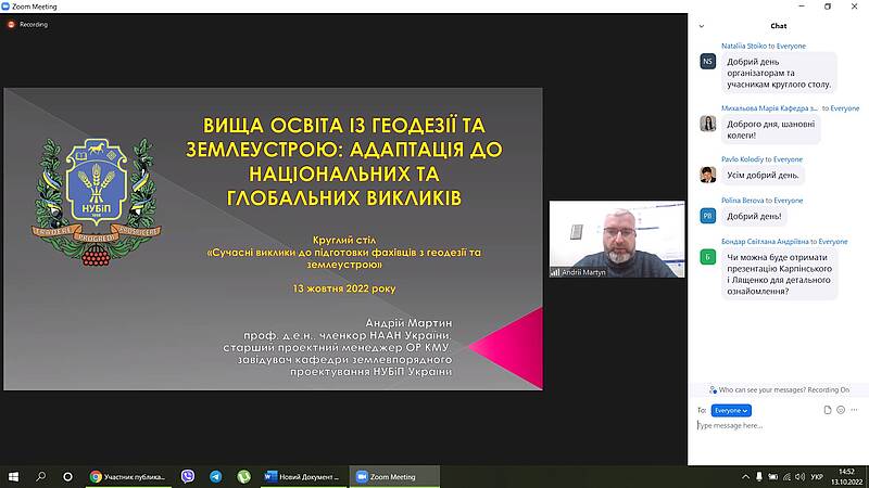 Викладачі кафедри проектування доріг, геодезії і землеустрою прийняли участь у засіданні Круглого столу «СУЧАСНІ ВИКЛИКИ ДО ПІДГОТОВКИ ФАХІВЦІВ З ГЕОДЕЗІЇ ТА ЗЕМЛЕУСТРОЮ»  13 жовтня 2022, яке відбулось за допомогою онлайн-платформи Zoom.