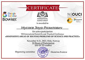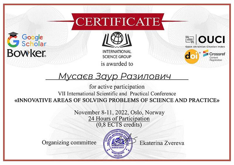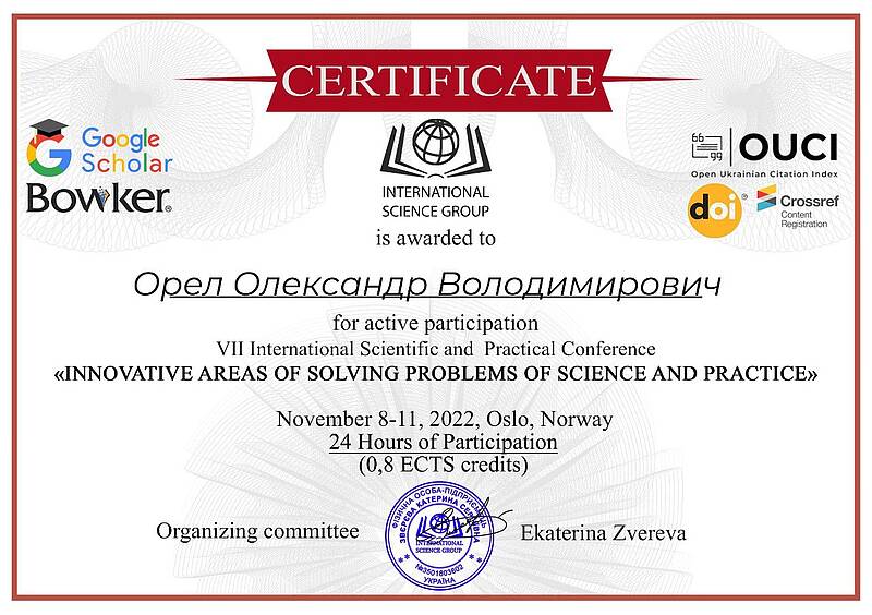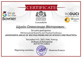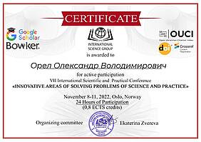 Вітаємо наших викладачів у вдалій участі в VII Міжнародна науково-практична конференція «Innovative areas of solving problems of science and practice», яка відбулася он-лайн 08-11 листопада 2022 р., в Осло, Норвегія.