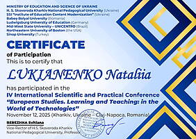 Cтарший викладач кафедри іноземних мов Носирєва Олена Валеріївна та викладач Лук'яненко Наталія Миколаївна взяли участь у IV Міжнародній науково-практичній конференції англійською мовою “European Studies. Learning and Teaching in the World of Technologies”, організованій кафедрою теорії і практики англійської мови та зарубіжної літератури імені професора Михайла Гетманця. За результатами участі викладачі отримали сертифікати учасників конференції, що підтверджують їхню активну наукову діяльність та прагнення до впровадження сучасних технологій у навчальний процес.