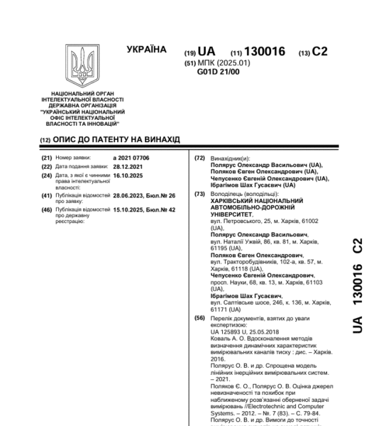 Винахідники кафедри проф. Полярус О. В., доц. Поляков Є. О. та аспіранти кафедри Чепусенко Є. О. та Ібрагімов Ш. Г. отримали патент на винахід "Спосіб визначення імпульсної характеристики вимірювального каналу тиску"