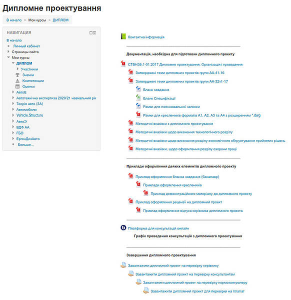 Викладачами кафедри автомобілів ім. А.Б.Гредескула розроблено на Навчальному сайті ХНАДУ ресурс «Дипломне проектування», на основі якого можливо проведення захисту дипломного проекту з використанням технологій дистанційного навчання. На ресурсі розміщено, контактну інформацію про дипломних керівників та консультантів, а також основні нормативні документи ХНАДУ, щодо дипломного проектування (СТВНЗ6.1-01:2017), методичні вказівки з дипломного проектування по кафедрі автомобілів ім. А.Б.Гредескула (укладачі Шуклінов С. М., Алексєєнко В. М., Ломака С. Й., Залогін М. Ю.), методичні вказівки, щодо оформлення економічного розділу дипломного проекту (укладач Михалевич М. Г. ), методичні вказівки кафедри ТМіРМ, щодо виконання технологічної частини дипломного проекту (укладачі Подригало М. А., Дудукалов Ю. В., Тарасов Ю. В. ), методичні вказівки щодо оформлення розділу охорони праці (укладачі Каслін М. Д. та Штода Л. В.). Також для роботи над дипломним проектом на ресурсі кафедри автомобілів ім. А. Б. Гредескула з дипломного проектування розміщені приклади виконання складальних, теоретичних та інших креслеників. Розміщено приклад оформлення демонстраційного матеріалу, приклади оформлення ВІДГУКА та РЕЦЕНЗІЇ на дипломний проект у відповідності до стандарту СТВНЗ6.1-01:2017 «Дипломне проектування. Організація і проведення», який затверджено в ХНАДУ. Робота керівників ДП зі студентами, як і робота з консультантами організована на ресурсі у відповідності до графіку консультацій, який узгоджено з Автомобільним деканатом. На ресурсі «Дипломне проектування» передбачено можливість спілкування учасників курсу через online конференцію, яка може бути записана за необхідності. Повноцінне завершення дипломного проектування на ресурсі «Дипломне проектування» кафедри автомобілів ім. А.Б.Гредескула забезпечується шляхом поетапного завантаження студентами дипломних проектів на перевірку керівникам, консультантам, нормоконтролеру та завідувачу кафедри у строки встановлені деканатом Автомобільного факультету через елементи ресурсу «Дипломне проектування».
