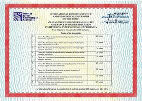 Загальний обсяг Міжнародного дистанційного науково-педагогічного стажування «Управління та внутрішнє забезпечення якості освіти у закладах вищої освіти: міжнародний досвід» склав 180 годин (6 кредитів ECTS), що підтверджено сертифікатом PL№273-09-25 від 16.09.2025.