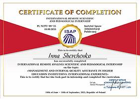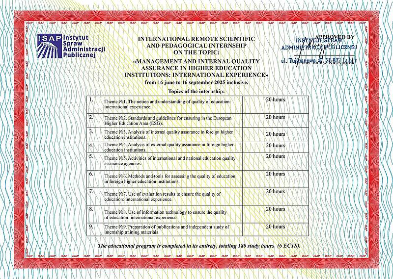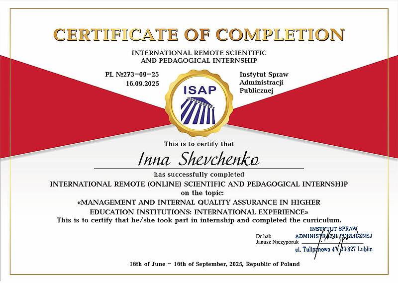 У період з 16 червня по 16 вересня 2025 року декан факультету управління та бізнесу, професор кафедри економіки і підприємництва, д.е.н., проф. Шевченко І.Ю. підвищила кваліфікацію за програмою Міжнародного дистанційного науково-педагогічного стажування «Управління та внутрішнє забезпечення якості освіти у закладах вищої освіти: міжнародний досвід» в Інституті справ адміністрації публічної ISAP (м. Люблін, Польща).