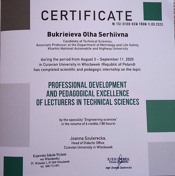 У період із 3 серпня по 11 вересня 2020 року в Куявському університеті у Влоцлавеку (Республіка Польща) к.т.н., доцент кафедри метрології та БЖД Букрєєва О.С. пройшла науково-педагогічне стажування на тему "Професійний розвиток та педагогічна майстерність викладачів із технічних наук" за фахом "Технічні науки" в обсязі 6 кредитів (180 годин).