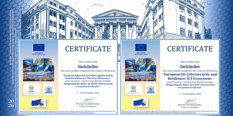 • Кібербезпека та стійкість: Курс «European EU Cybersecurity and Resilience: ICT Ecosystem» (обсягом 30 годин), що фокусувався на екосистемі ІКТ та стійкості кібербезпеки в ЄС. Навчання тривало з 1 по 25 грудня 2025 року.