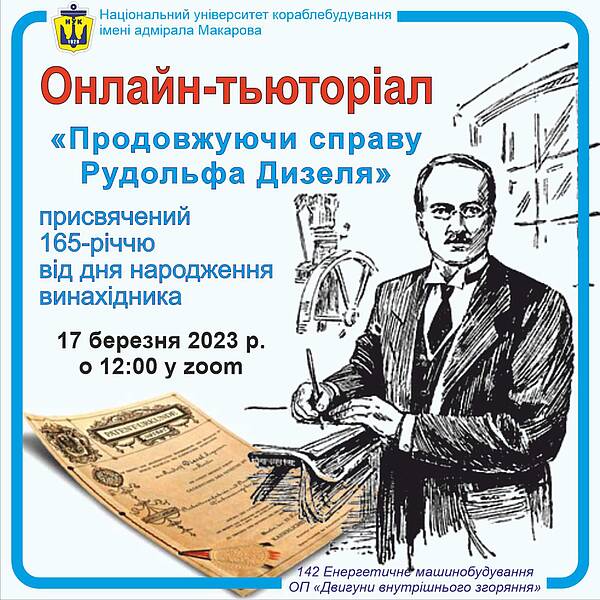Шановні студенти! Національний університет кораблебудування імені адмірала Макарова (м. Миколаїв) запрошує взяти участь у онлайн-заходах, присвячених ювілею винахідника дизельного двигуна Р. Дизелю.