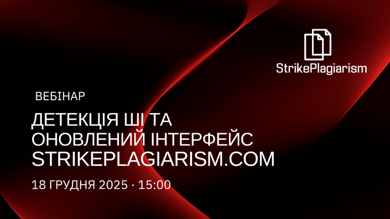 18 грудня о 15:00 відбудеться онлайн-вебінар, організований компанією StrikePlagiarism, до участі в якому запрошуються викладачі, здобувачі вищої освіти та адміністративні працівники закладів вищої освіти.