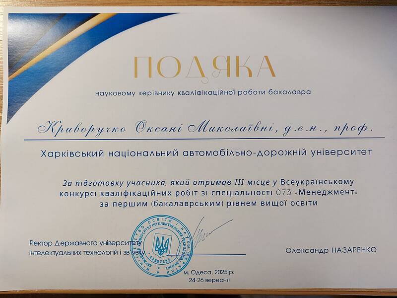 ІІІ місце (бакалаврський рівень, 1-й рівень вищої освіти) — Віолета Павленко, спеціальність 073 «Менеджмент». Науковий керівник — проф. Оксана Криворучко.