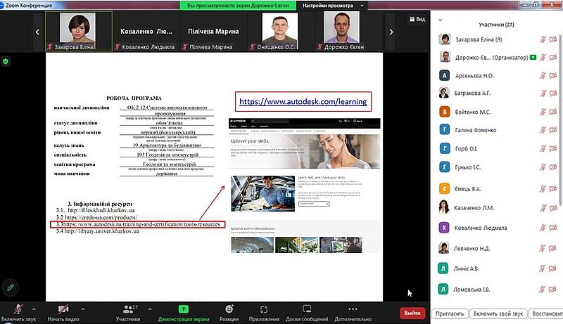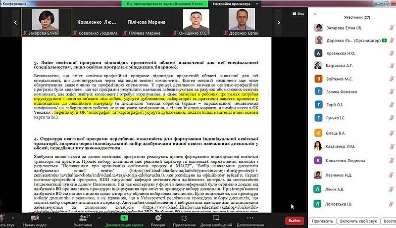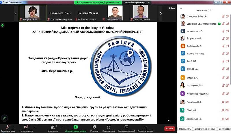 08 березня 2023 р. в онлайн форматі відбулось розширене засідання кафедри проектування доріг, геодезії і землеустрою, на яке були запрошені члени проєктної групи ОП, НПП інших кафедр, які викладають ОК на ОП, представники ЗВО, що реалізують ОП за спеціальністю 193 «Геодезія та землеустрій», стейкхолдери.