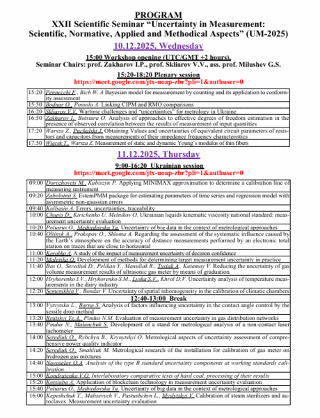 10.11.2025 та 11.12.2025 р. відбувся XXII Міжнародний науково-технічний семінар «Невизначеність вимірювань: наукові, нормативні, прикладні та методичні аспекти» (“Uncertainty in Measurement: Scientific, Normative, Applied and Methodical Aspects”, UM-2025) у онлайн форматі.
