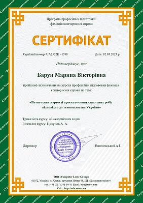 По закінченню курсу отримала підтверджуючий сертифікат UA2302E - 1398 02.03.2023 р.