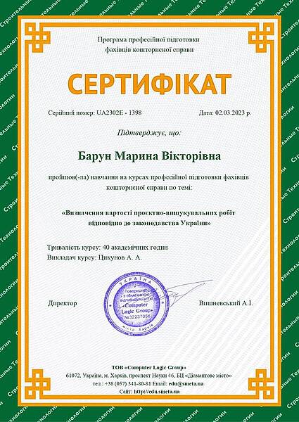 Доцент кафедри екології Барун Марина Вікторівна успішно пройшла навчання професійної підготовки фахівців кошторисної справи по темі: «Визначення вартості проєктно-вишукувальних робіт відповідно до законодавства України». Тривалість курсу: 40 академічних годин Викладач курсу: Цикунов А. А.