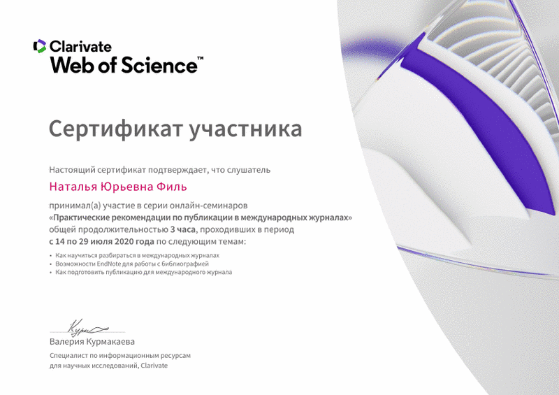Під час відпустки викладачі кафедри АКІТ продовжували підвищувати свою кваліфікацію. Зокрема, доцент кафедри Н.Ю. Філь взяла участь в ряді онлайн семінарів, що проводилися компанією Clarivate Analytics.