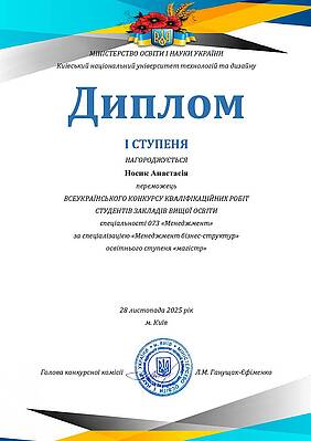 28 листопада 2025 року відбувся щорічний Всеукраїнський конкурс кваліфікаційних робіт студентів закладів вищої освіти за спеціальністю «073 Менеджмент», який проходив в онлайн-форматі на базі Київського національного університету технологій та дизайну. У конкурсі взяли участь студенти з різних регіонів України, представляючи свої дослідження у межах кількох спеціалізацій.