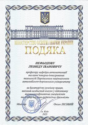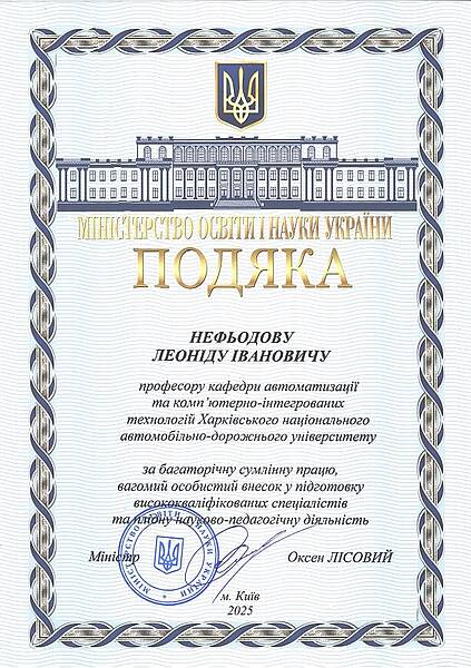 Вітаємо професора Нефьодова Леоніда Івановича з отриманням Почесної грамоти Міністерства освіти та науки України