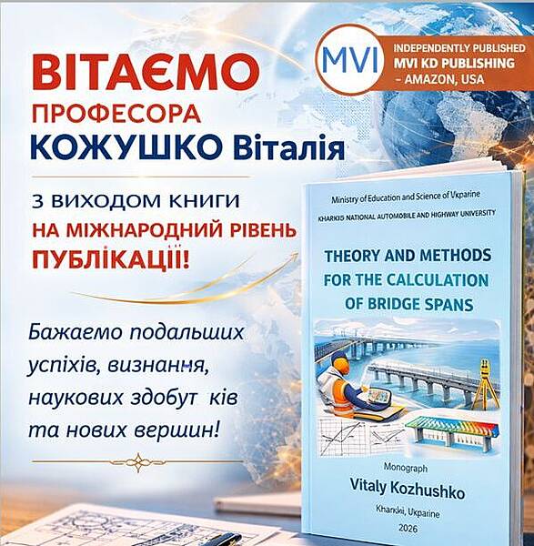 У Харківському національному автомобільно-дорожньому університеті в рамках реалізації програми профспілки щодо підготовки та публікації 95 наукових і навчальних видань на міжнародному рівні, присвячених 95-річчю ХНАДУ, вийшла монографія "Теорія і методи розрахунку прольотних будов" професора кафедри мостів, конструкцій і будівельної механіки ім. В. О. Російського Кожушка Віталія Петровича.