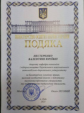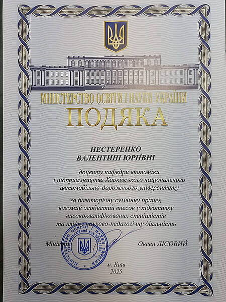 Колектив кафедри економіки і підприємництва щиросердно вітає доцента кафедри, к.е.н., доц. Нестеренко Валентину Юріївну з нагородженням Подякою Міністерства освіти і науки України за багаторічну сумлінну працю, вагомий особистий внесок у підготовку висококваліфікованих спеціалістів та плідну науково-педагогічну діяльність.