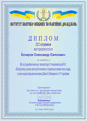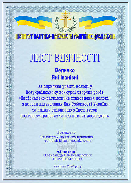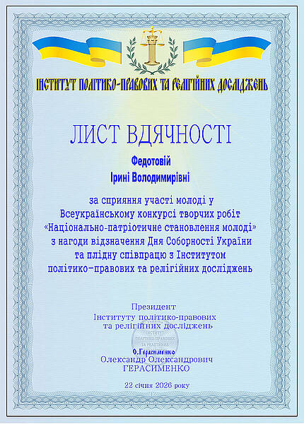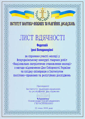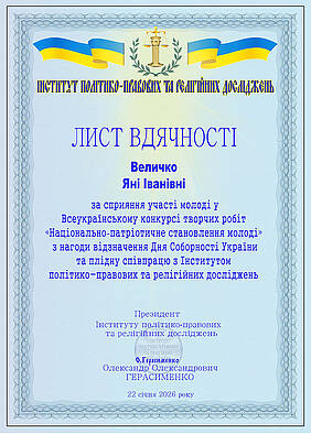 22 січня, у День Соборності України, відбулося урочисте вручення дипломів і сертифікатів учасникам та переможцям Всеукраїнського конкурсу творчих робіт «Національно-патріотичне становлення молоді», ініційованого Інститутом політико-правових та релігійних досліджень.