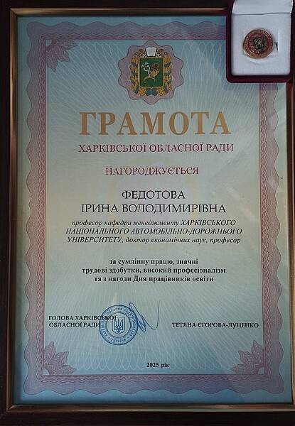 Колектив кафедри менеджменту щиро вітає професора Ірину Федотову із отриманням Грамоти Голови Харківської обласної ради Тетяни Єгорової-Луценко за сумлінну працю, значні трудові здобутки, високий професіоналізм та з нагоди Дня працівників освіти!