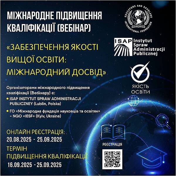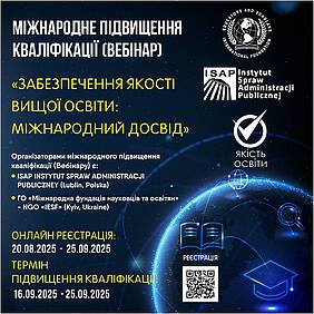 Інститут справ адміністрації публічної ISAP (м. Люблін, Польща) та IESF Міжнародна фундація науковців та освітян запрошують науково-педагогічних працівників і здобувачів вищої освіти до міжнародного підвищення кваліфікації (вебінару) на тему «Управління та внутрішнє забезпечення якості освіти у закладах вищої освіти: міжнародний досвід», що відбудеться 07-16 жовтня 2025 року.